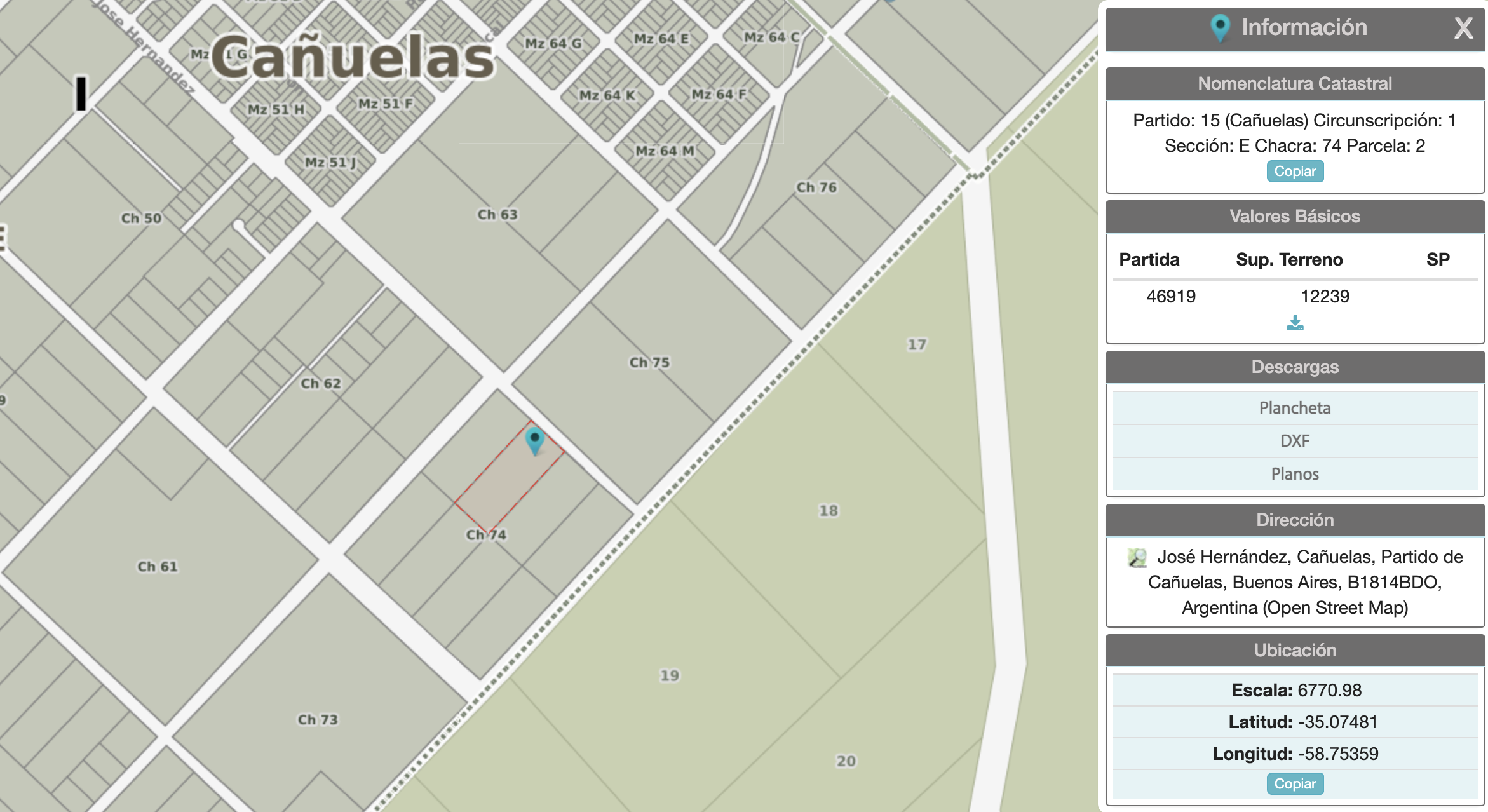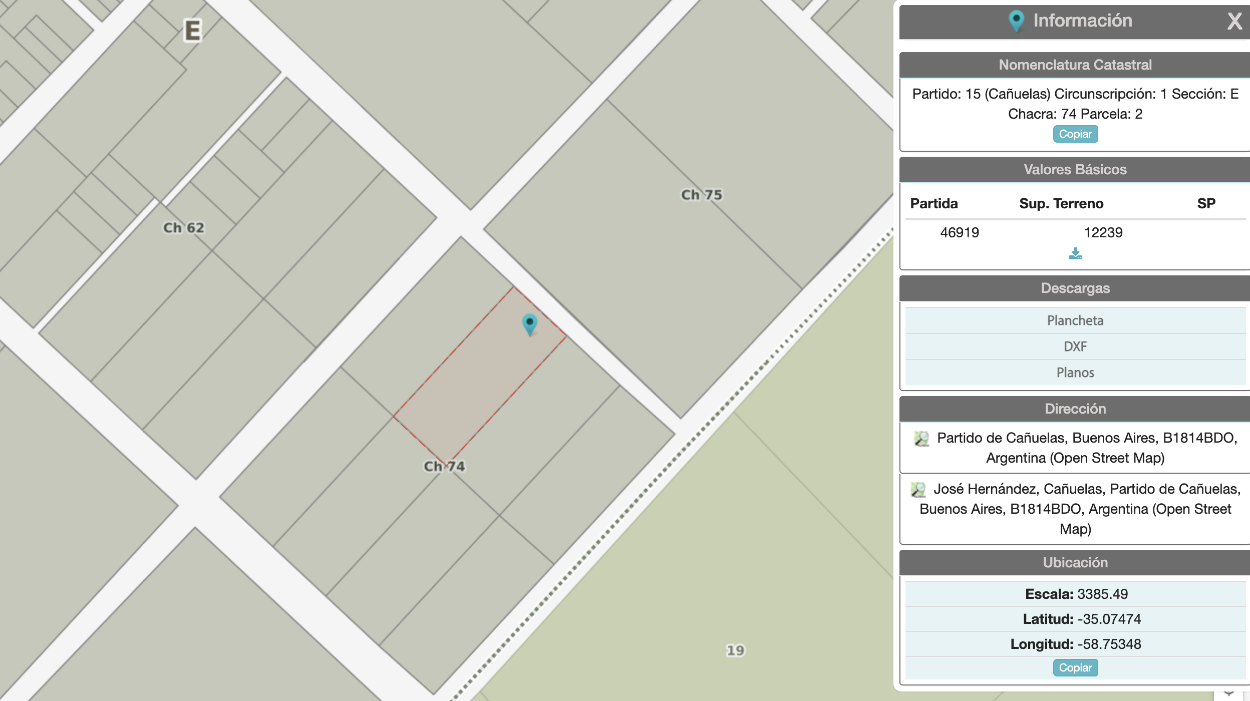 Partido: 15 (Cañuelas) Circunscripción: 1 Sección: E Chacra: 74 Parcela: 2